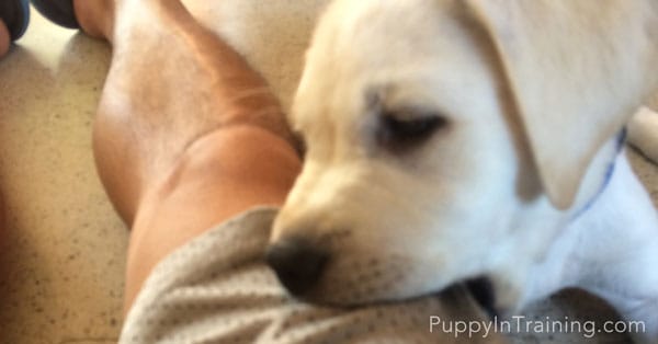 Puppies bite a lot. Make your puppy think he is hurting you when he bites by letting out a puppy yelp. She particularly goes for feet but if youre wearing shoes she likes to go for your ankles or even knees if she can.
